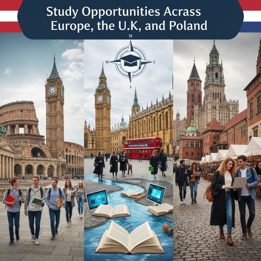 Study in Europe, the U.K., and Poland offers diverse cultures, world‑class universities, and vibrant student life. The U.K. provides globally respected institutions, Europe blends tradition with innovation, and Poland delivers quality education at affordable costs. Together, they create rich academic and personal growth opportunities.